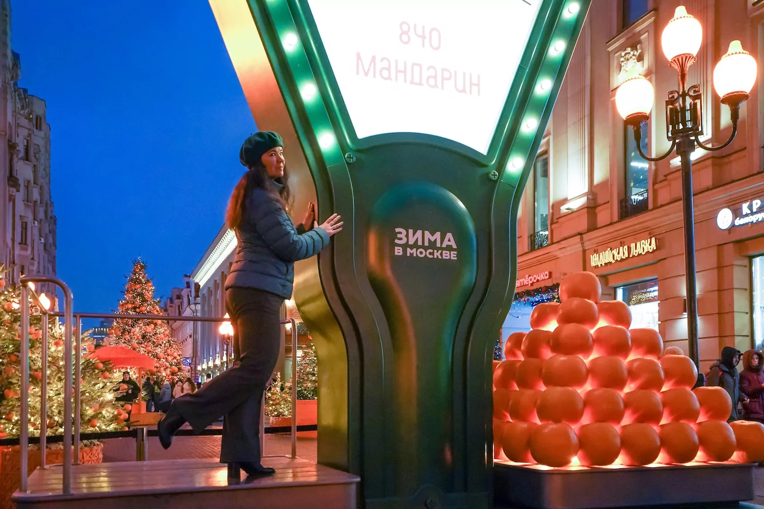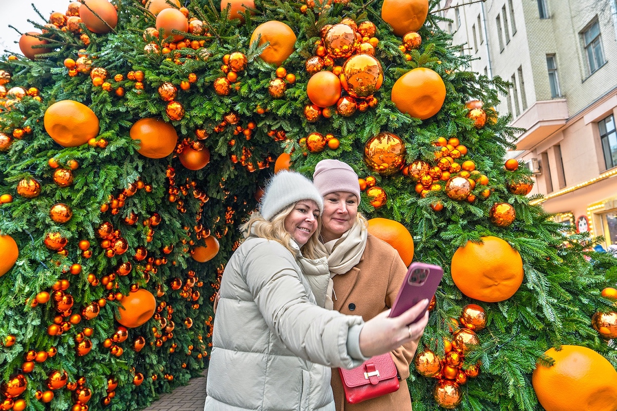 Пешеходная зона Арбата преобразилась к праздникам: здесь находится около 100 тыс. искусственных мандаринов, которыми украшены все новогодние елки вдоль улицы. Каждый муляж точно повторяет форму и насыщенный оранжевый цвет настоящих фруктов, чаще всего встречающихся на столичных прилавках в декабре и январе. Аромат живых елей дополняет праздничную картину.