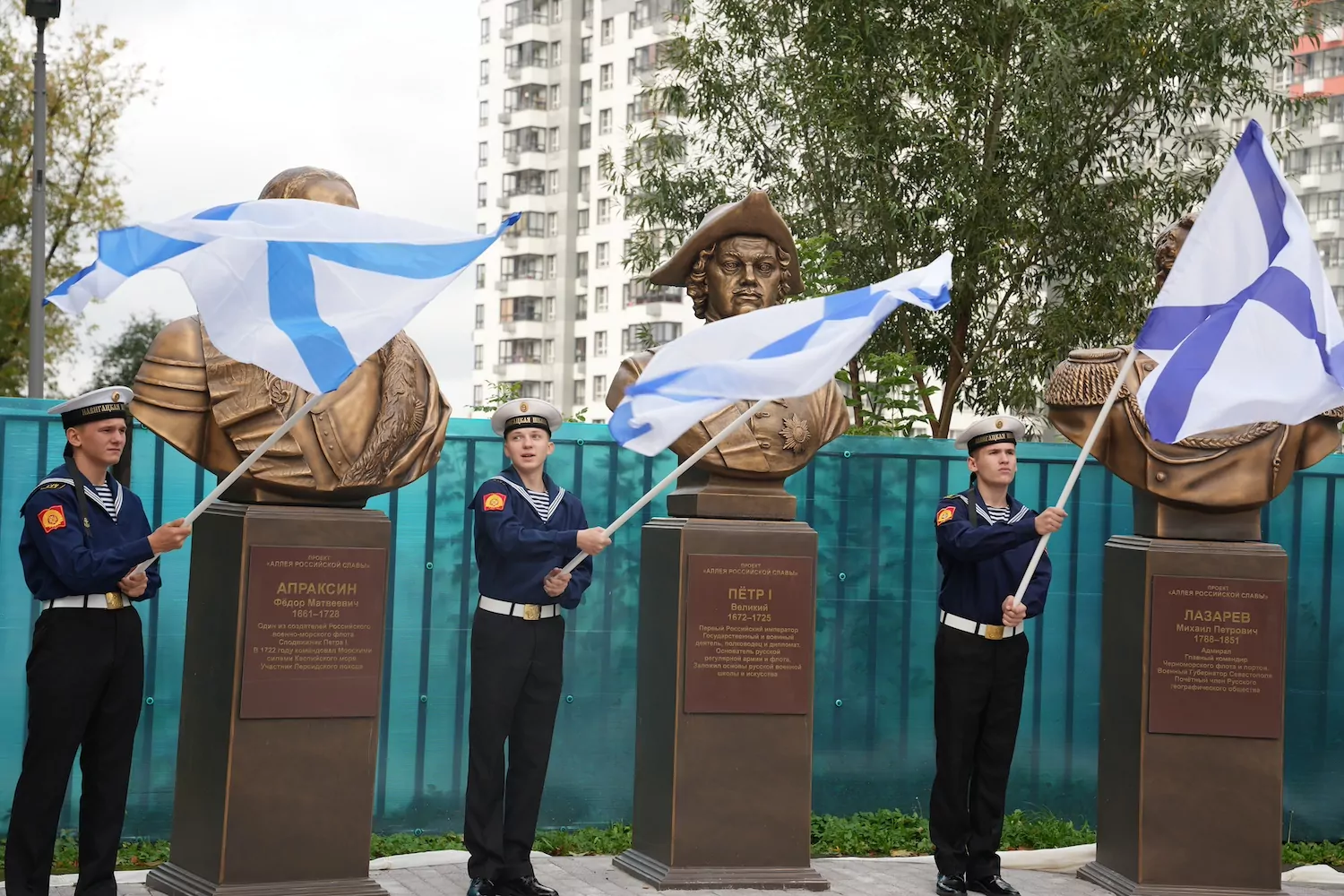 Спадает покрывало, и зрителям открываются бронзовые бюсты деятелей, принесших славу отечественному флоту. Они установлены на мраморных постаментах, к которым прикреплены памятные таблички с рассказом о заслугах и подвигах героев. В центре аллеи — бюст создателя Российского флота Петра Первого. Вслед за ним — его сподвижник Федор Апраксин, непобедимый адмирал Федор Ушаков и основатель флота на Черном море Григорий Потемкин. Рядом находятся скульптуры героев Севастопольской обороны Владимира Корнилова и Павла Нахимова. Здесь же — отлитые в металле образы героя русско-турецких войн Дмитрия Сенявина, одного из первооткрывателей Антарктиды Михаила Лазарева, пионера в использовании ледоходов Степана Макарова, героя Великой Отечественной войны Николая Кузнецова и организатора отечественного ракетно-ядерного флота Сергея Горшкова.