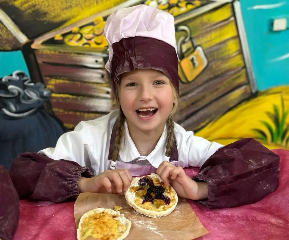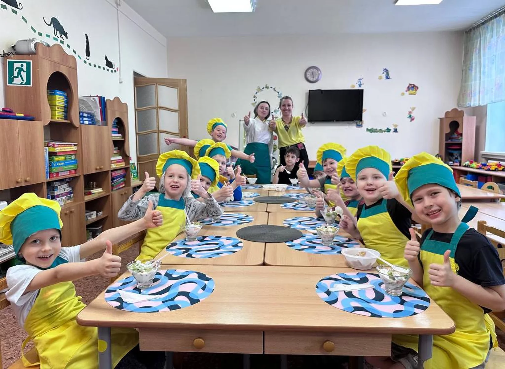 Дошкольники с большим удовольствием надели фартуки и колпаки, вымыли руки и заняли свои места. На столах уже были подготовлены все необходимые ингредиенты: оладьи, изюм, фруктовая пастила, ягодное варенье, сгущенка, дольки мандаринов и апельсинов.