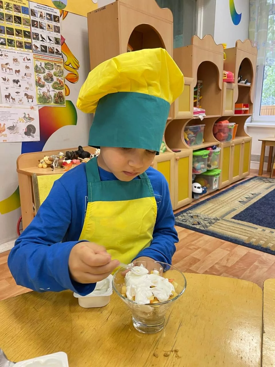 Дошколята традиционно надели поварские колпаки и фартуки и приступили к работе. Под руководством Динары Абзялетдиновой ребята начали выкладывать ингредиенты в специальные креманки для десертов. Первым слоем — крошку печенья, вторым — ложку творожка, третьим — нарезанные кусочки яблока. Все дети готовили слоеный десерт впервые, поэтому очень старались ровно уложить необходимые ингредиенты, чтобы в креманке десерт выглядел красиво. После того как все проверили правильную последовательность ингредиентов в десерте, приступили к дальнейшим слоям: крошки печенья, кусочков бананов, творожка и киви. Технолог комбината питания чутко следила за процессом и помогала ребятам. Заключительным этапом приготовления стало добавление сгущенки, которая придала десерту сладость и украсила получившееся блюдо.