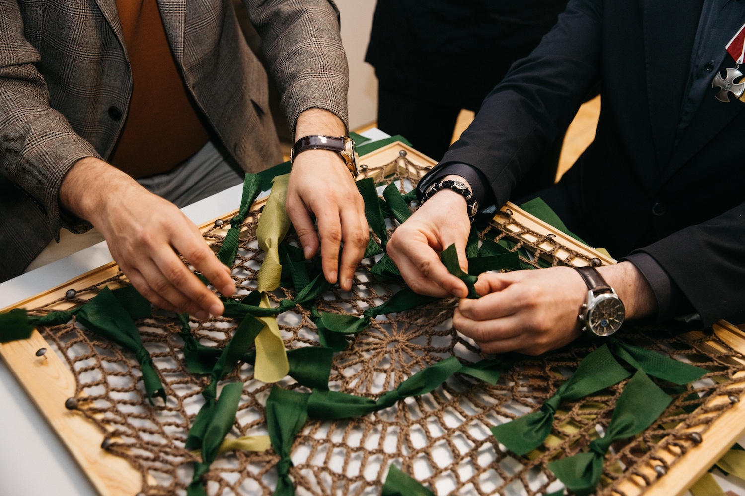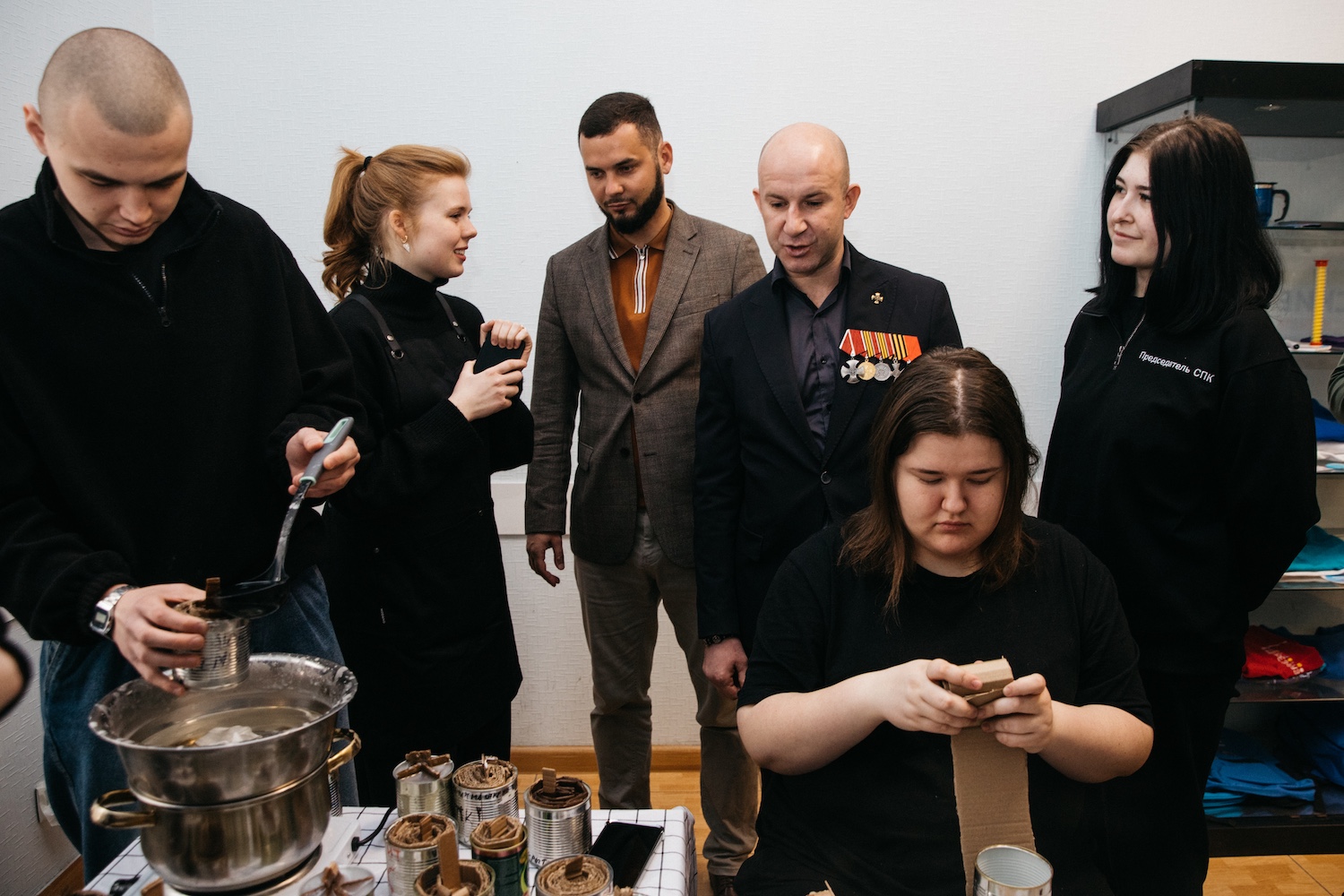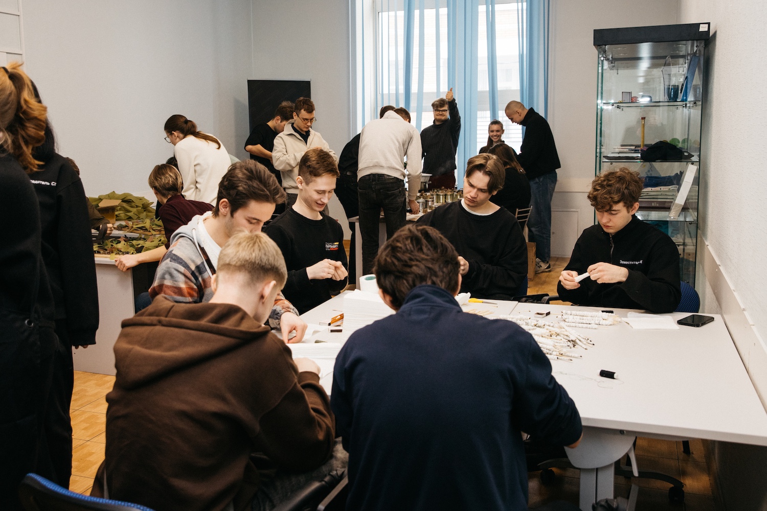 Гости не просто наблюдали — они включились в процесс наравне со студентами. Владислав Гусев и Александр Постников своими руками участвовали в мастер-классах, а затем пообщались с волонтерами, которые на регулярной основе помогают фронту.