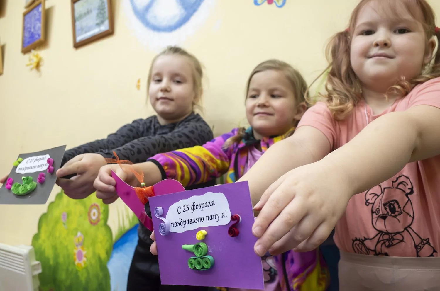 Каждый создал собственную объемную открытку. Творческие работы стали трогательными подарками для пап и дедушек к празднику.