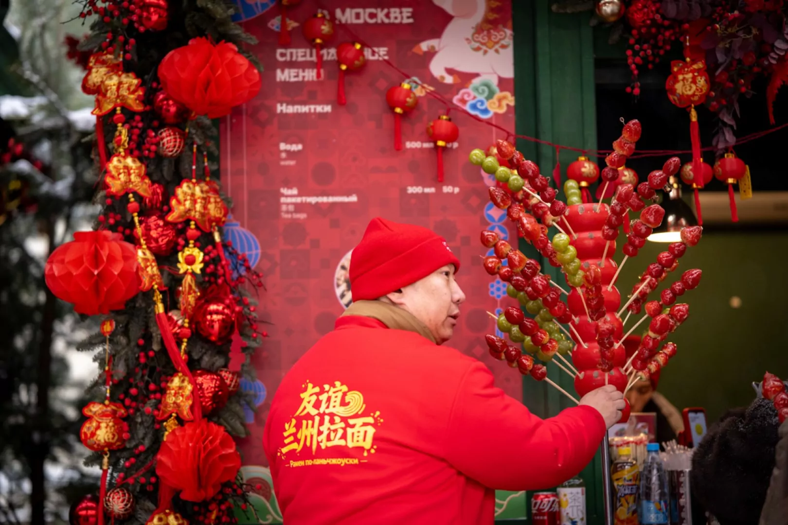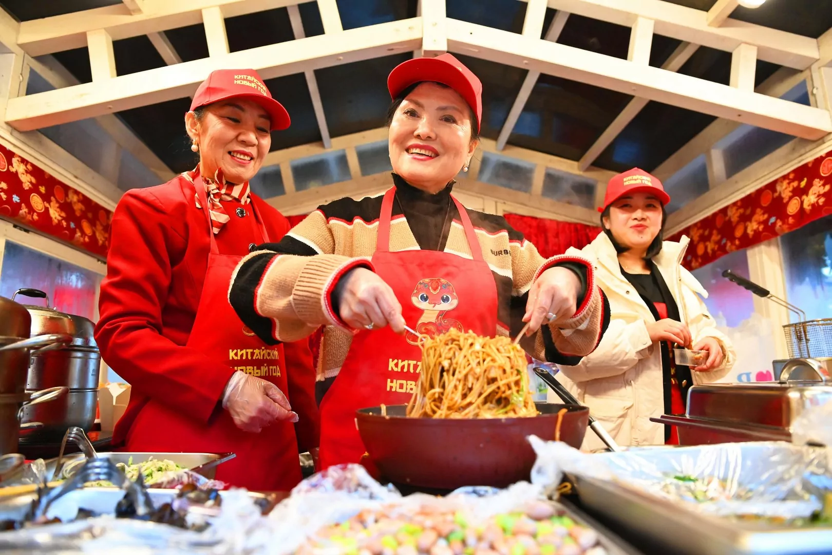 Площадка на Манежной площади оформлена в ярком восточном стиле с декоративными элементами и арт-объектами, создающими праздничную атмосферу. Основной акцент сделан на аутентичные блюда китайской кухни, представленные в нескольких шале. Гости могут начать с холодных закусок: освежающих битых огурцов «Пай Хуан Гуа», салата из древесных грибов «Муэр» с орехами или спаржевого салата. Среди теплых закусок — классические шашлычки на гриле, мини-шашлычки «Хого» с мясом, морепродуктами и овощами, а также хрустящие куриные лапки.