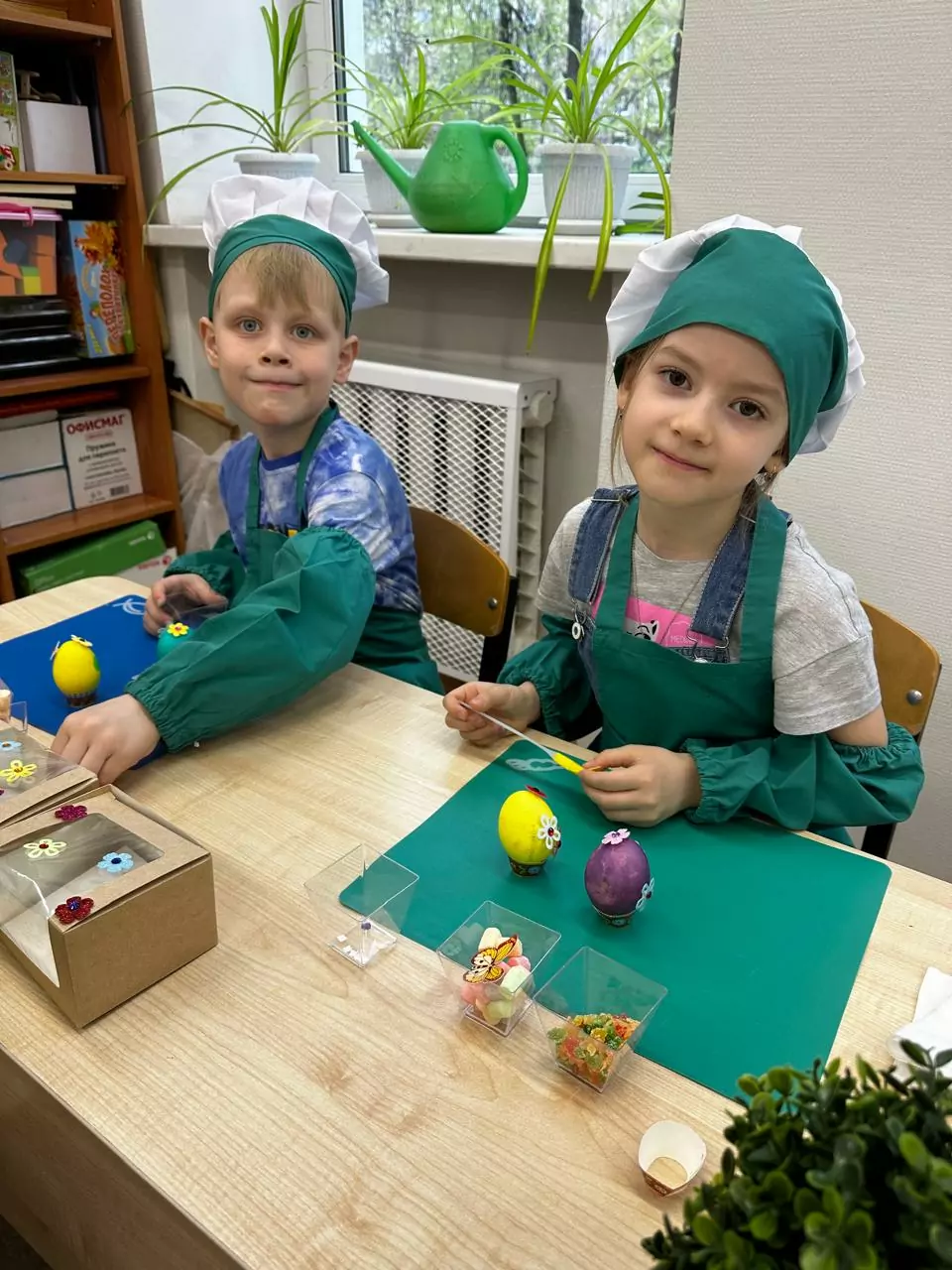 Как только часть работы была завершена, и будущие куличи отправлены в печь, ребята занялись изготовлением еще одного пасхального атрибута. Дети раскрашивали в разные цвета уже сваренные яйца и декорировали их весенней аппликацией — цветами и бабочками.