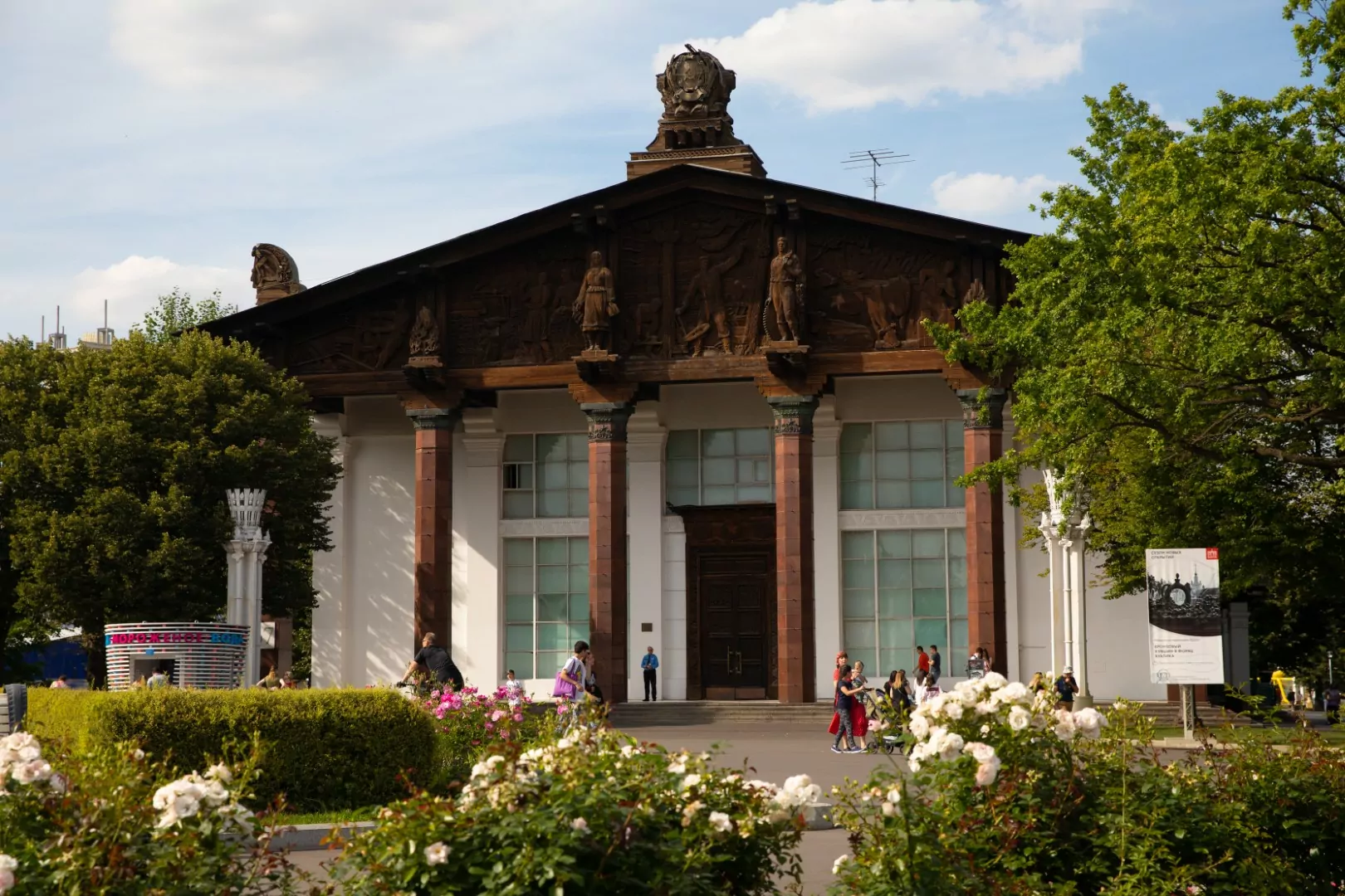Произведение 70 лет назад создал советский скульптор Лев Кардашов, который специализировался на технике резьбы по дереву. Сегодня композиция остается главным украшением павильона.