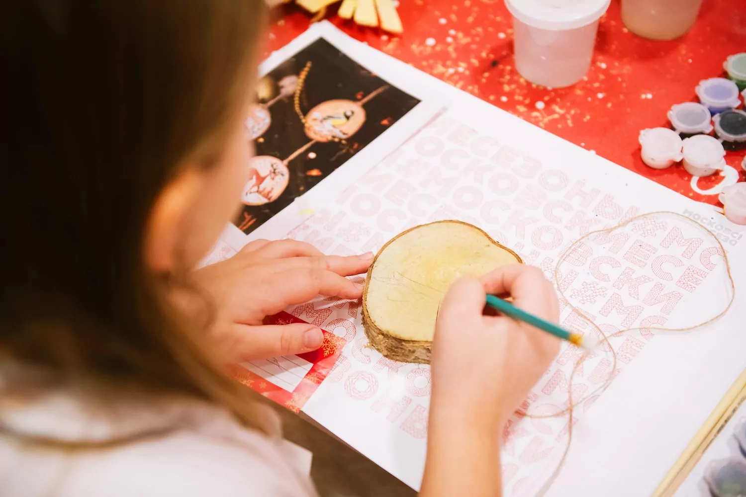 В сквере по Олонецкому проезду дети расписывают керамические и деревянные игрушки в форме конфет, часов, колокольчиков, карусели или котенка Гава из мультфильма. Узоры вдохновлены новогодними мотивами, сказкой «Морозко» и московской архитектурой.