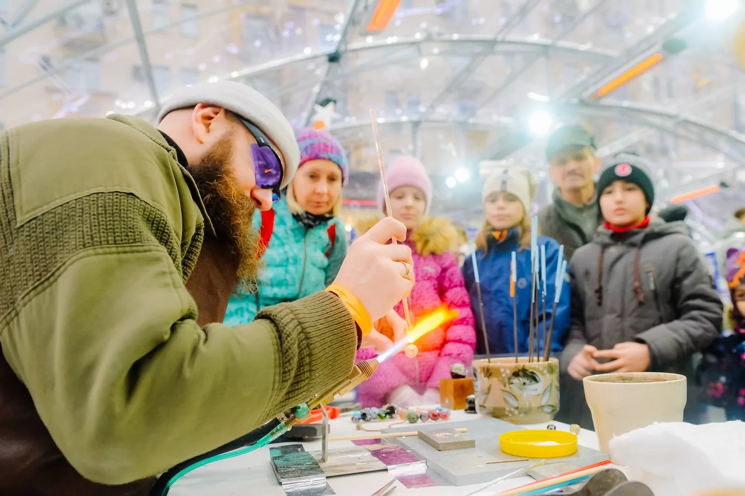 На Тверской площади ребята мастерят свечи из натуральной вощины, осваивают чеканку и создают металлические елочные украшения.
