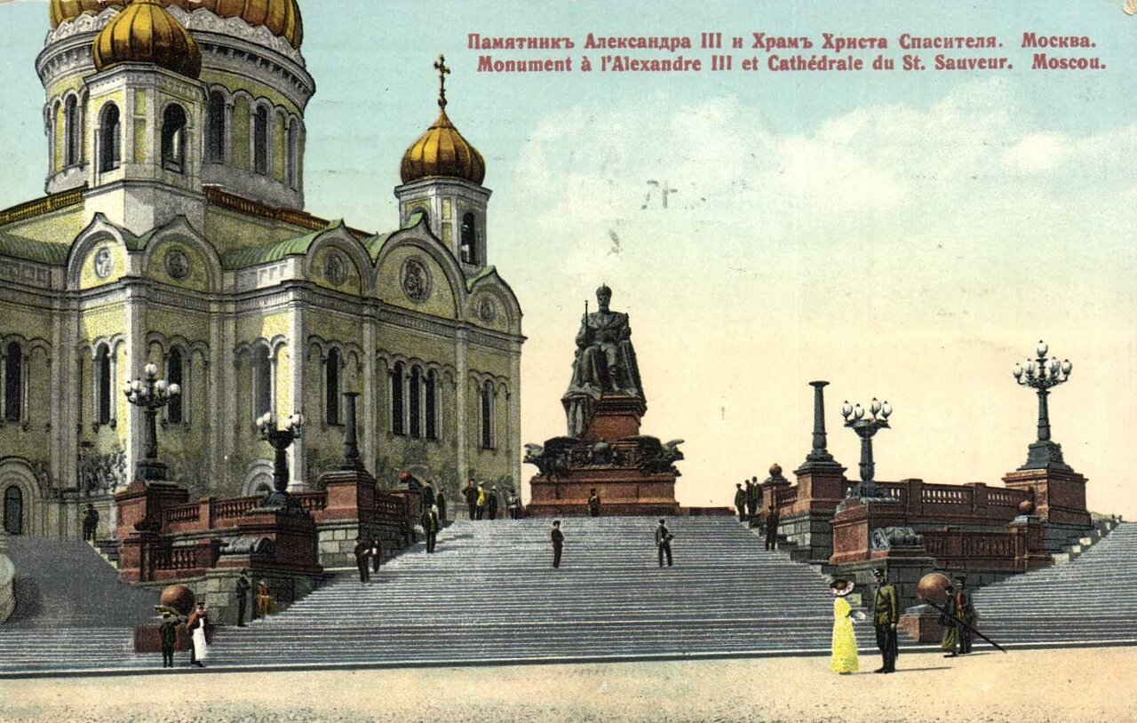 Открытка с изображением храма Христа Спасителя и монумента Александру III, начало ХХ века