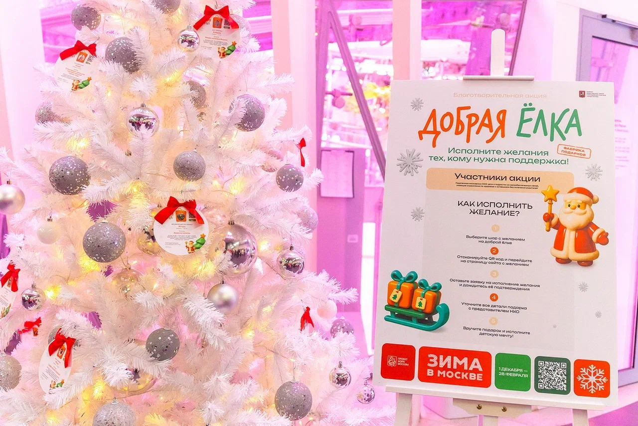 «Добрая елка» предложит каждому исполнить мечту ребят — подопечных московских фондов и НКО — выбрать подарок по QR-коду у елки или по номеру на сайте гуманитарной акции и вручить его.
