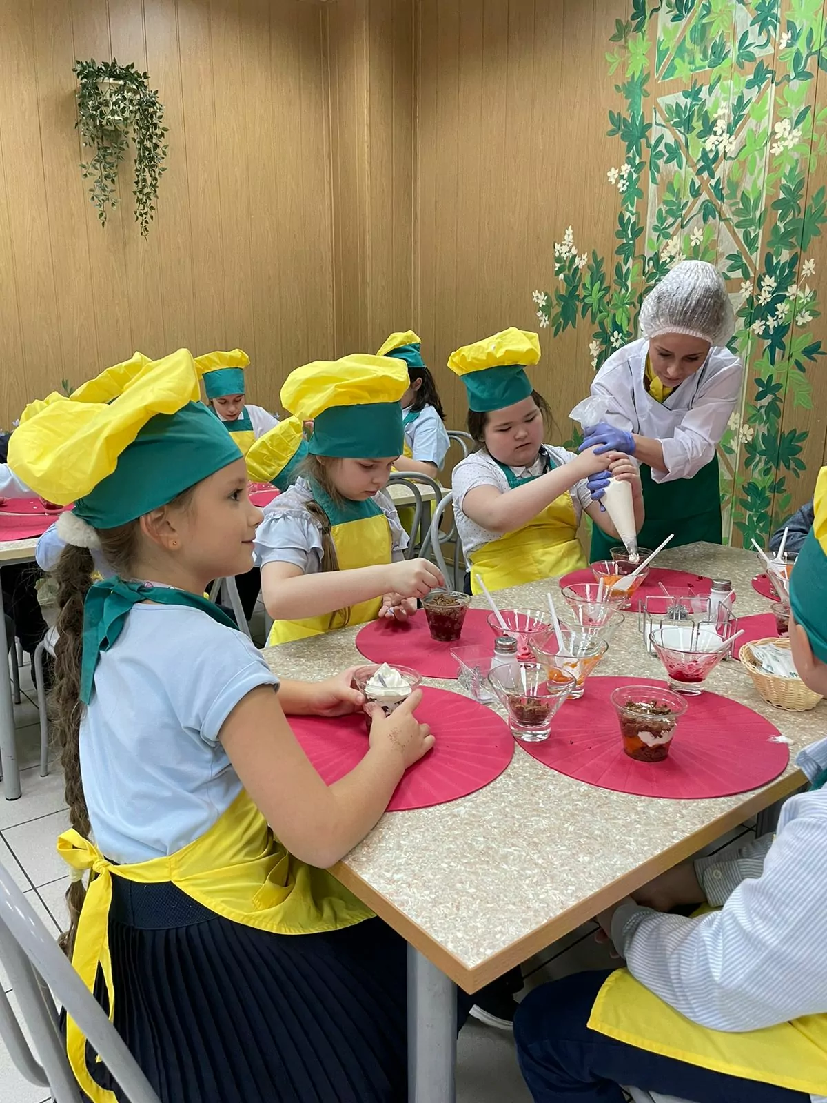 По традиции ученики переоделись в поварскую форму: яркие желто-зеленые фартуки и колпаки. Далее ребята приступили к самому главному — приготовлению задуманного десерта.