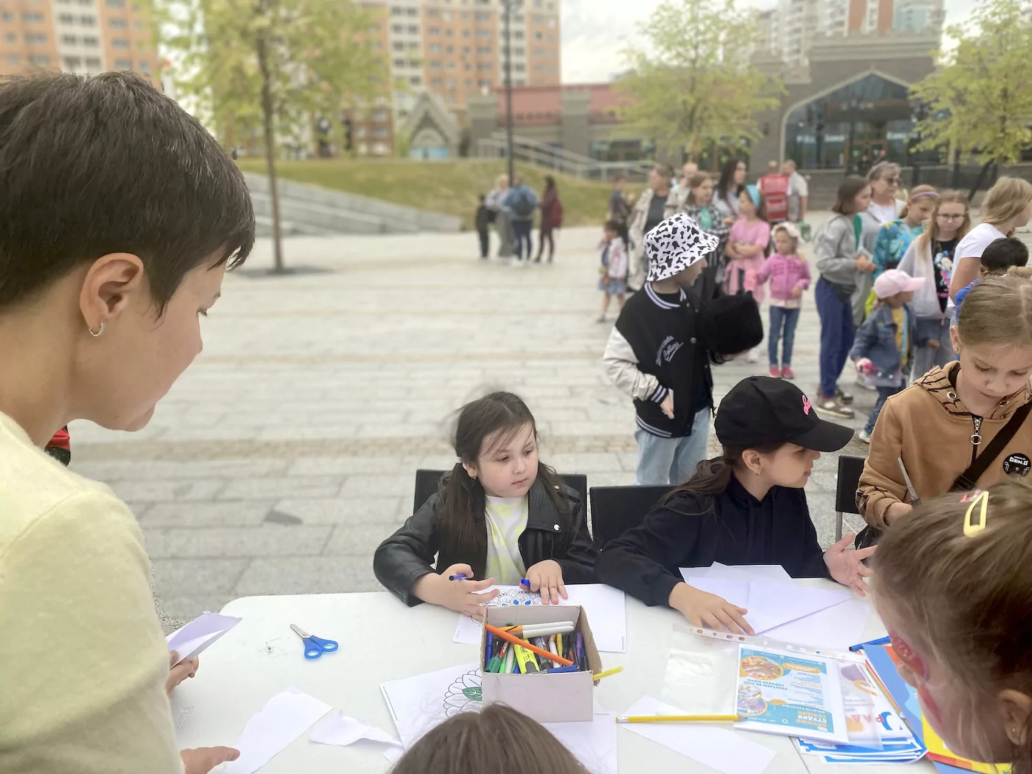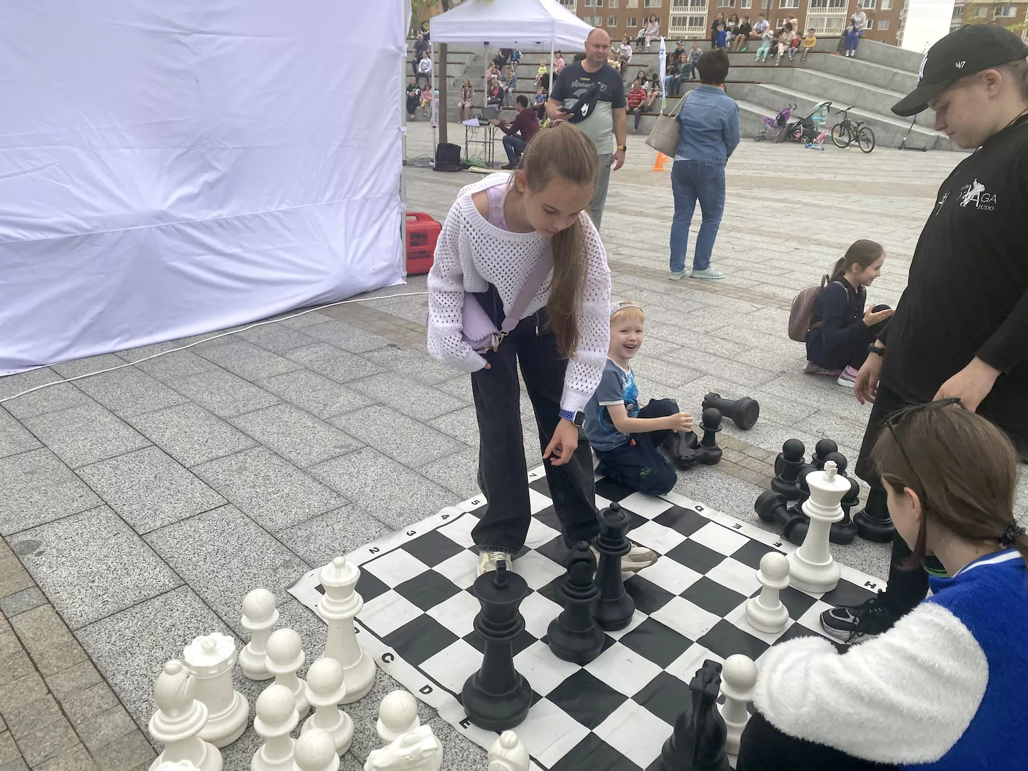 Дети смогли сыграть в огромные шахматы и ярко раскрасить картинки. Весёлое музыкальное сопровождение добавило атмосферы и энергии во время задорных танцев.