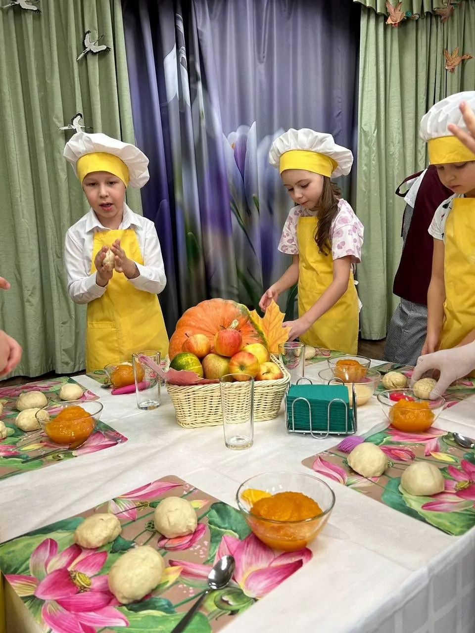Дошкольники узнали технологию приготовления и под руководством поваров комбината питания аккуратно раскатали шарики теста до необходимого размера и сделали углубление для укладывания начинки из тыквенного конфитюра.