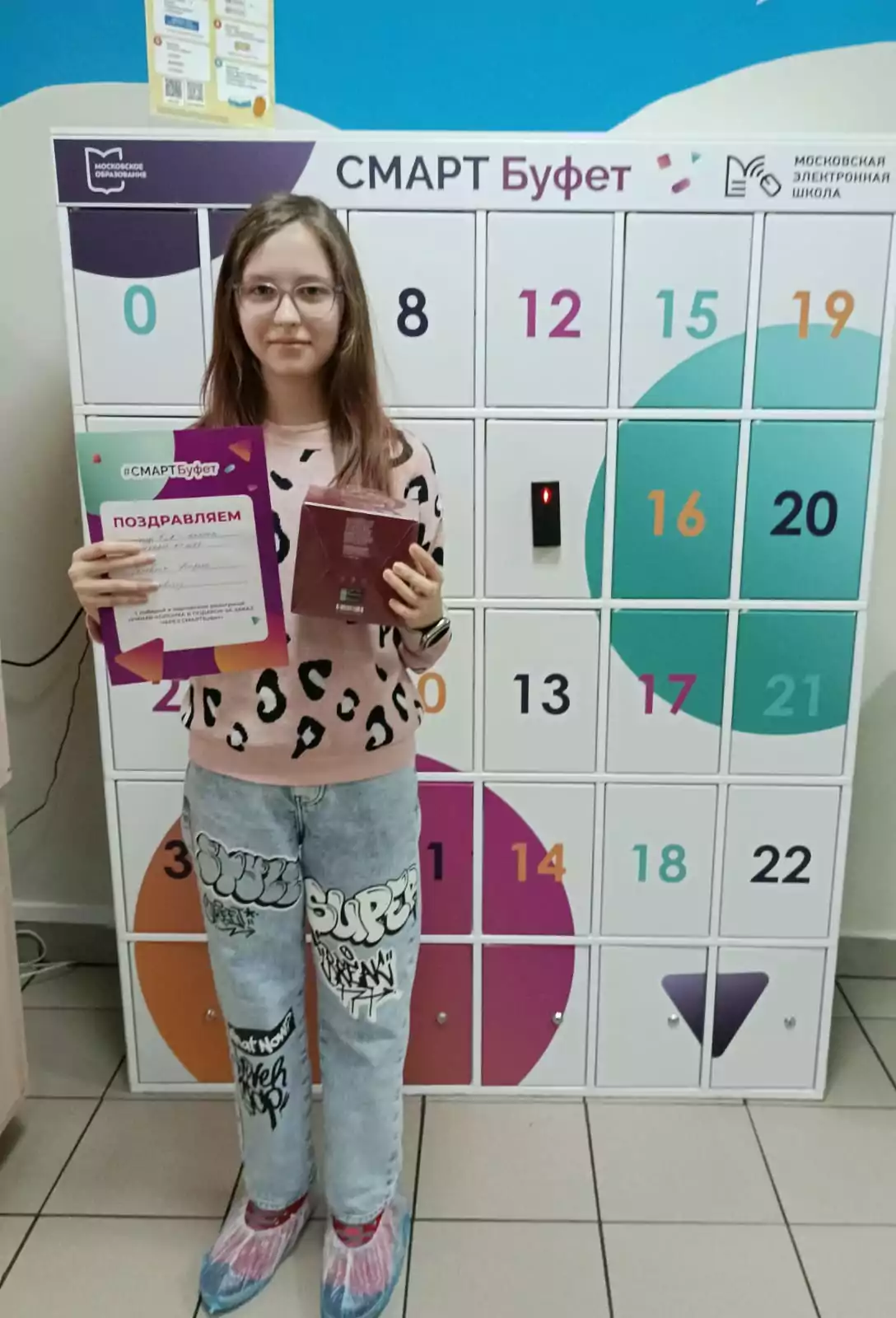 Пятиклассница Дарья Попович из школы № 1273 заинтересовалась возможностями постамата еще в начале года: «О “СмартБуфете” нам рассказала учительница, и с тех пор я заказываю через него хлебцы — не надо в очереди стоять».