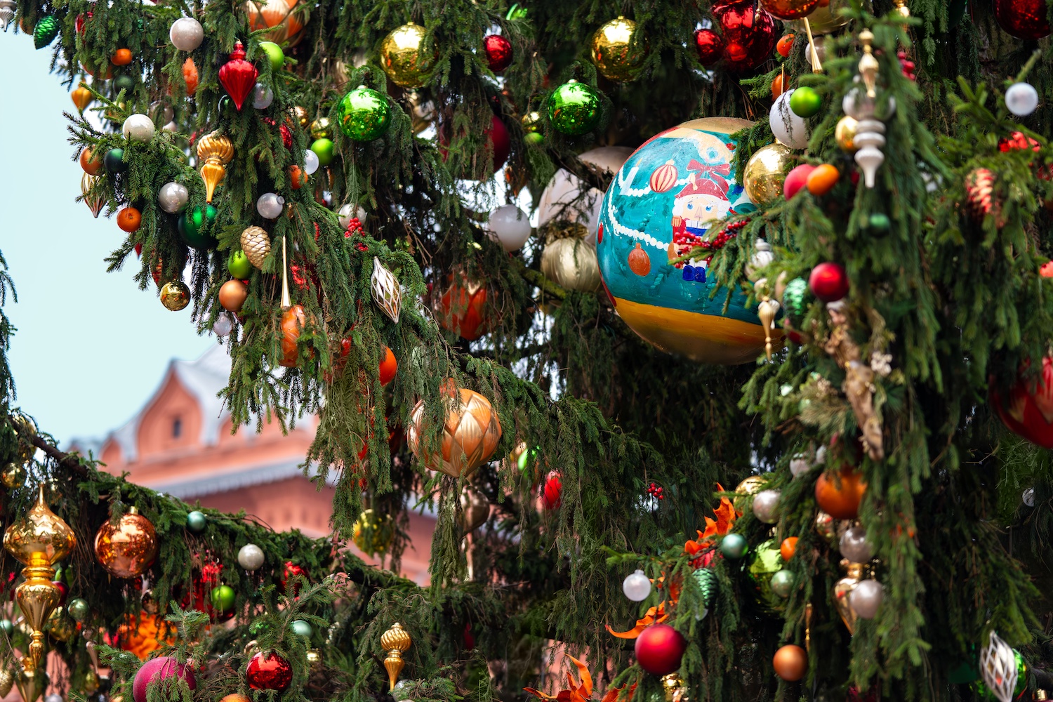 На Манежной площади разместили натуральную ель высотой около 22 метров, привезенную из Тверской области. Декор дерева основан на стиле старинных русских игрушек. Для украшения использованы крупные расписные шары, фигурки и световые элементы. Монтаж выполнялся с участием альпинистов, так как работы велись на значительной высоте.