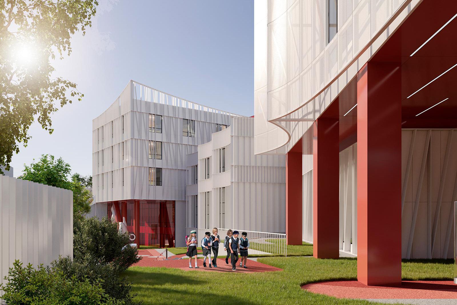 Перед специалистами стояла задача вписать школу в существующую застройку. Они создали проект пятиэтажного здания площадью около 20 тыс. кв. м.