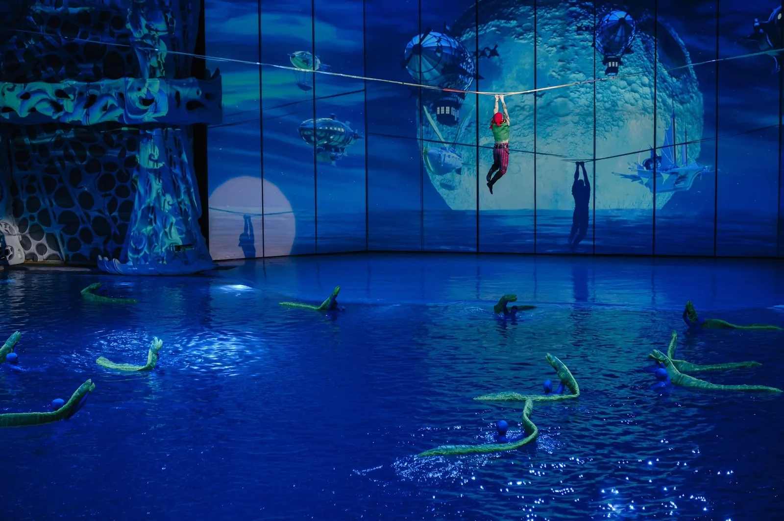Красивейшие видеоинсталляции и трехмерные проекции на гигантской рельефной декорации площадью 770 квадратных метров создают полноценную иллюзию присутствия зрителей в центре событий. Представление сопровождается 5D-эффектами: ароматы океана, туман и морской бриз. Украшением мюзикла стали 32 танцующих фонтана, которые взлетают на высоту 9 метров.