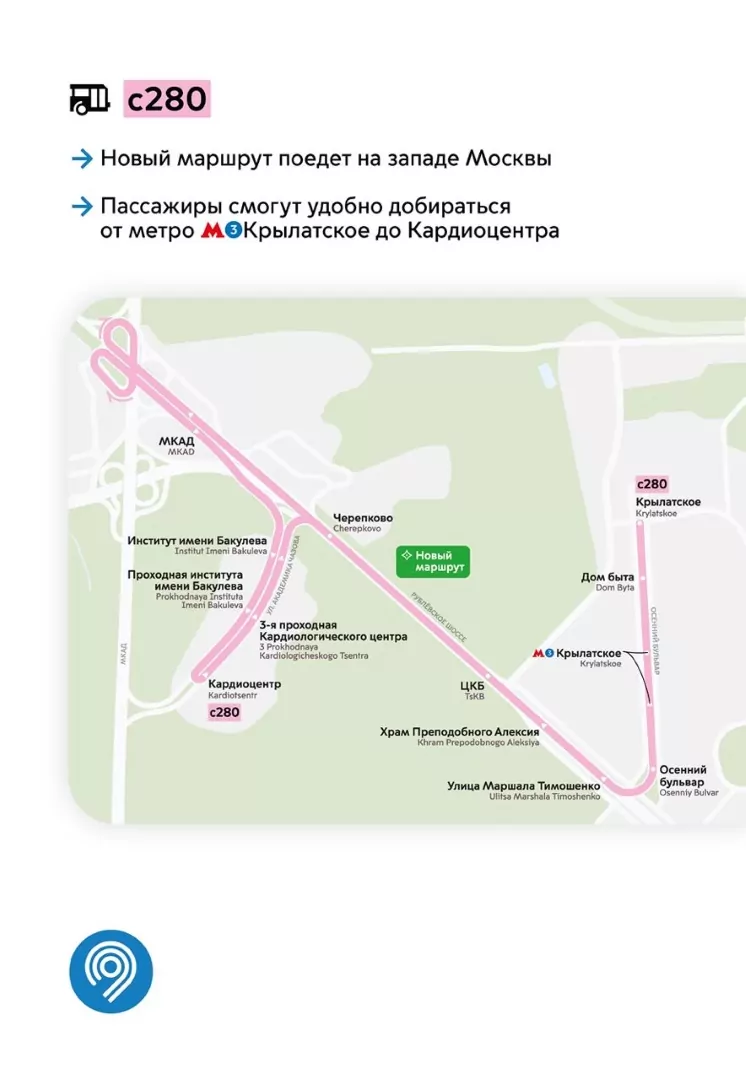 Один из маршрутов запустят на западе столицы. На транспорте с номером с280 жители смогут доехать от метро «Крылатское» до кардиоцентра. Еще один маршрут (№ 298) начнет работать в районе метро «Саларьево». А маршрут № 915 свяжет несколько станций метро и МЦК на юго-западе и юге города.