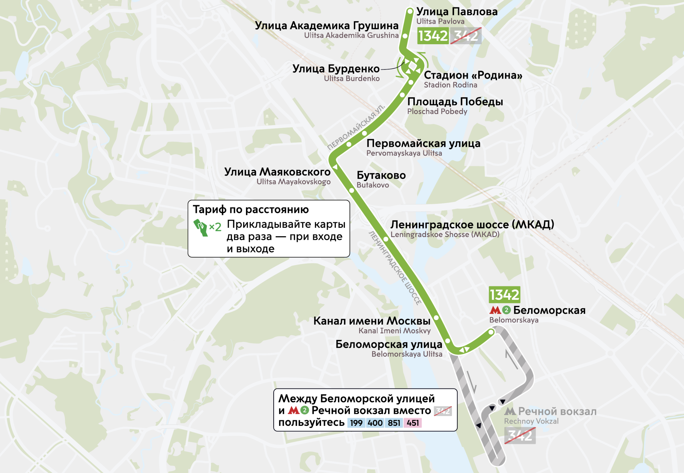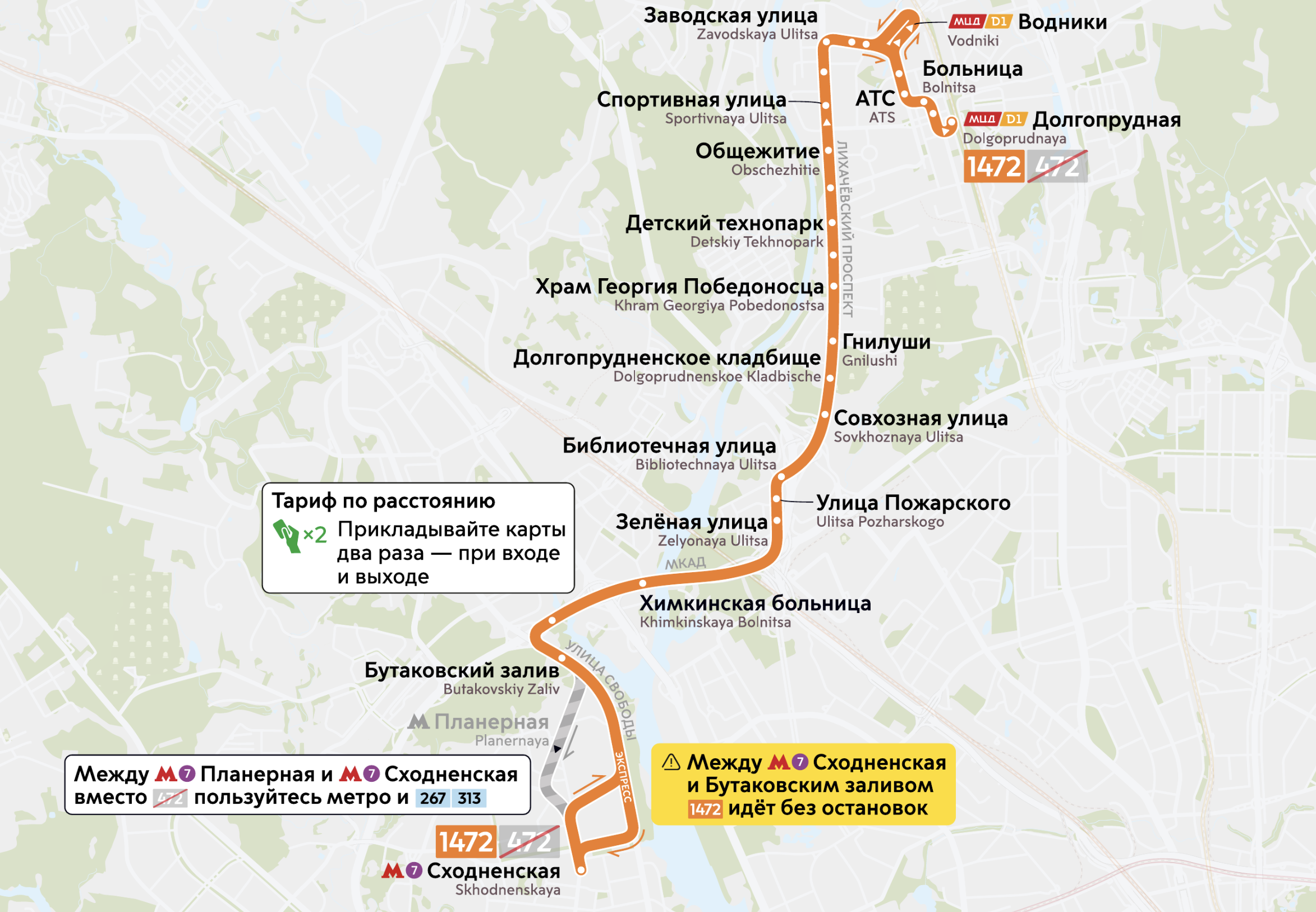 Цены на проезд на маршрутах 1342 и 1472 будут рассчитываться в зависимости от расстояния. Карту «Тройка» пассажирам необходимо прикладывать при входе и выходе из автобуса. Цена поездки на маршруте 1342 составит от 63 до 72 руб., на маршруте 1472 — от 63 до 120 руб. При оплате банковской картой стоимость будет отличаться незначительно.