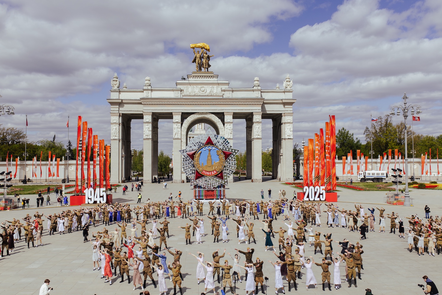 В День Победы во всех округах работали площадки с трансляцией парада на Красной площади, выступлениями коллективов и солистов. Со сцен звучали «Священная война», «Темная ночь», «Жди меня». 80-летие Победы стало темой ландшафтного фестиваля «Сады и цветы»: дизайнеры украсили улицы авторскими композициями с кипарисами, лавандой, розами и полевыми растениями. А на Арбате создали аллею памяти с экранами для строк из фронтовых писем.