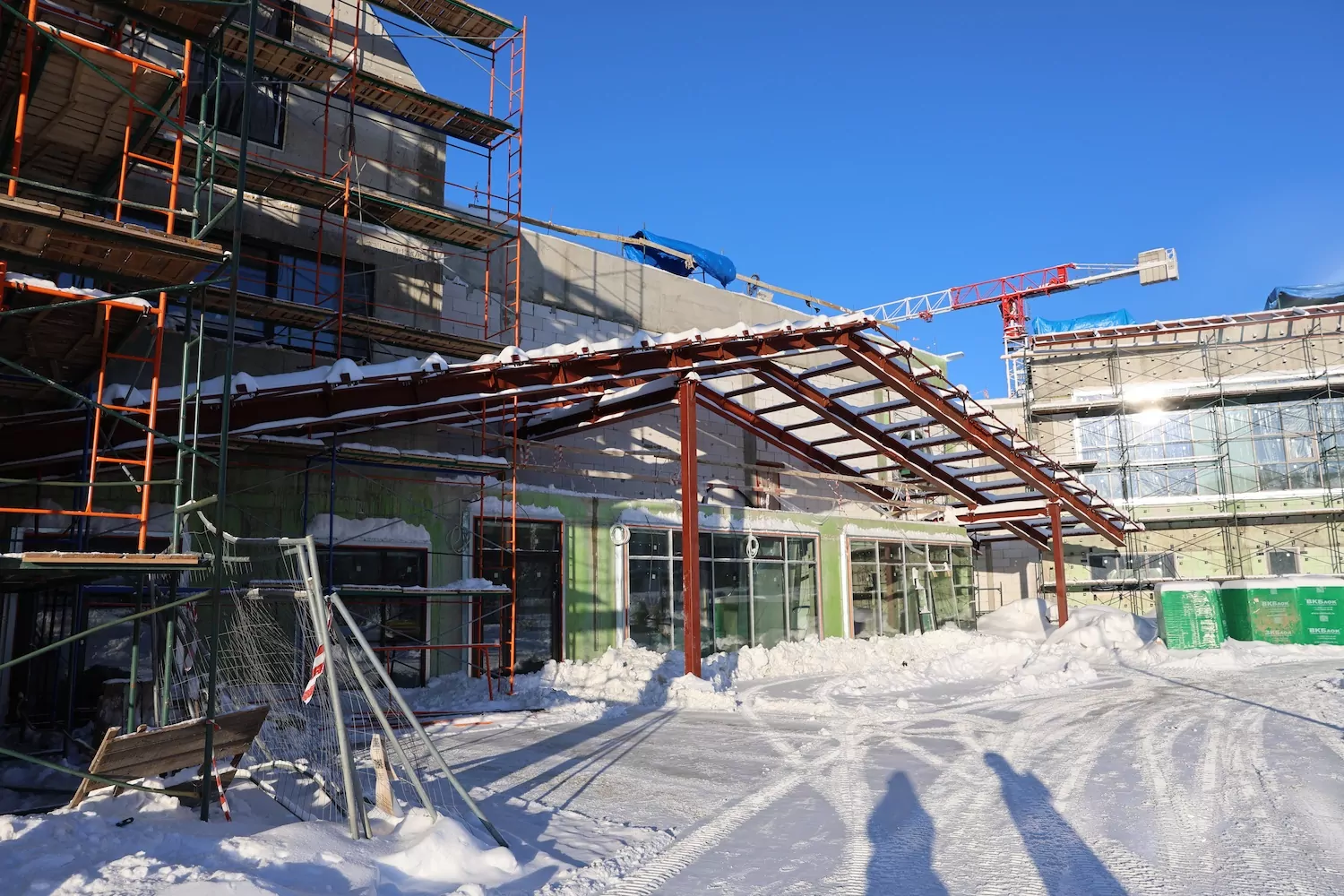 Дошкольная площадка рассчитана на 220 детей и девять групп. Строители начали установку внутренних элементов освещения, витражных конструкций и ограждений. В холлах смонтировали лифты, а на улице продолжают фасадные работы. На территории обустроили основания для прогулочных площадок и проездов.