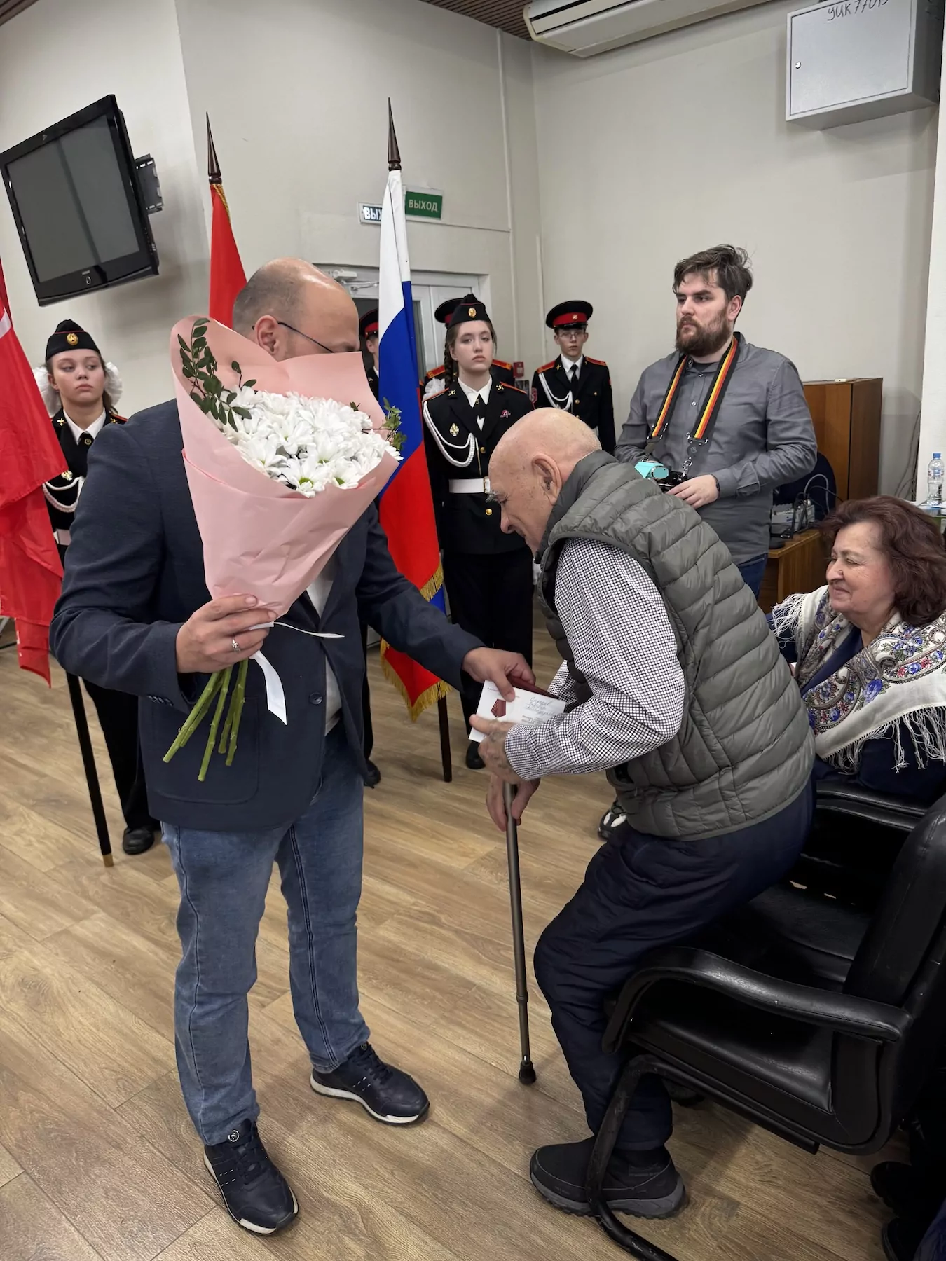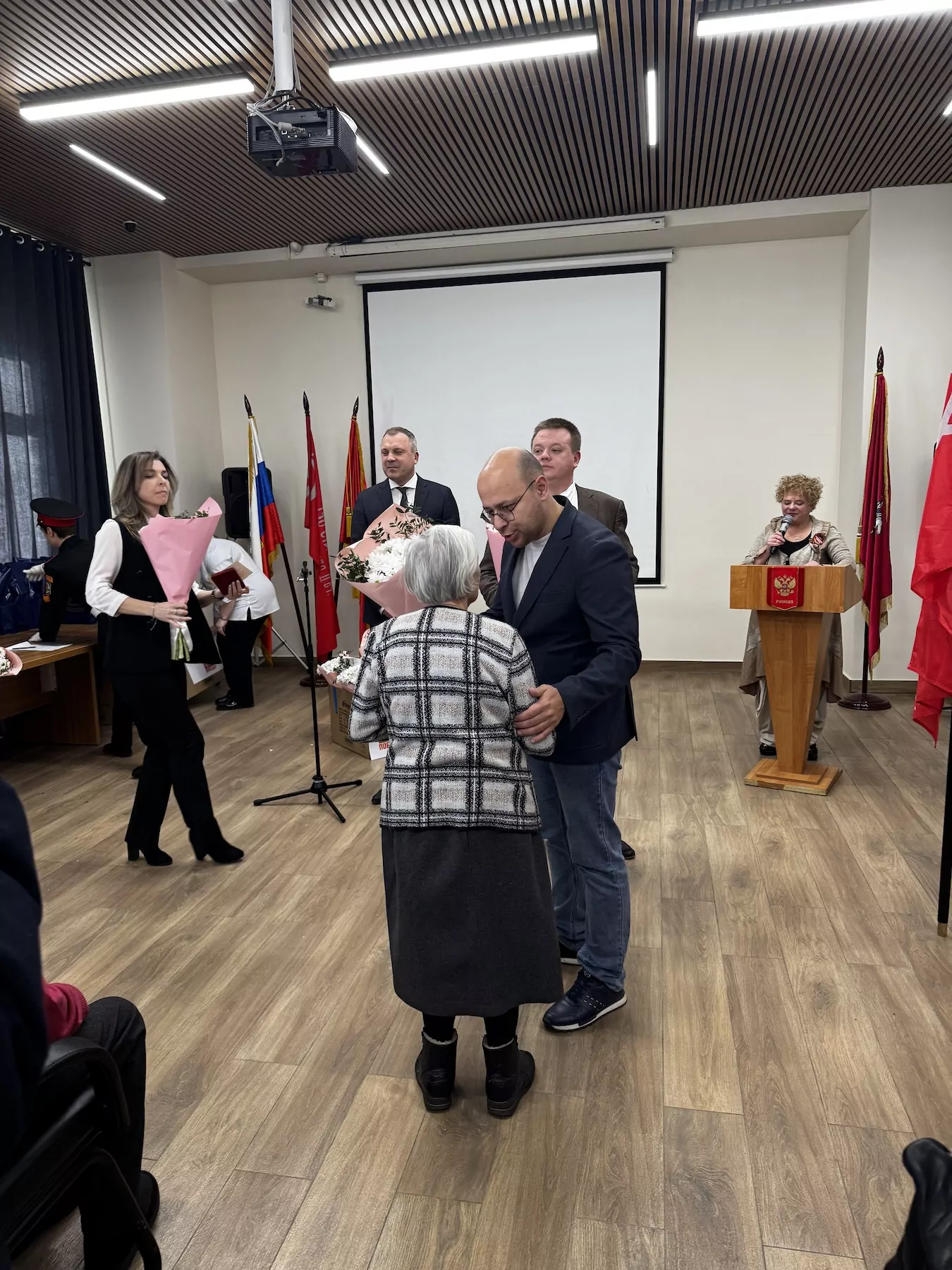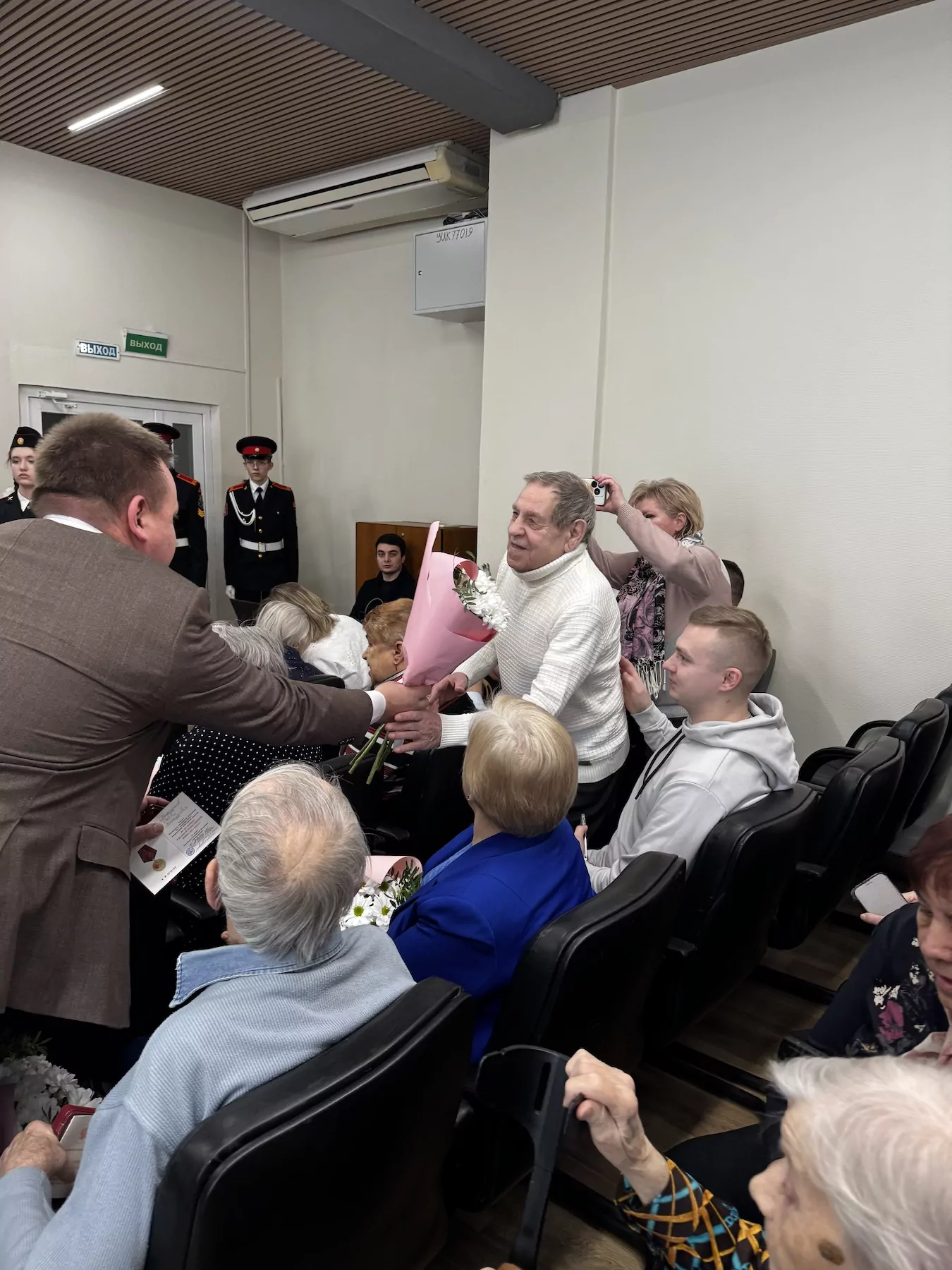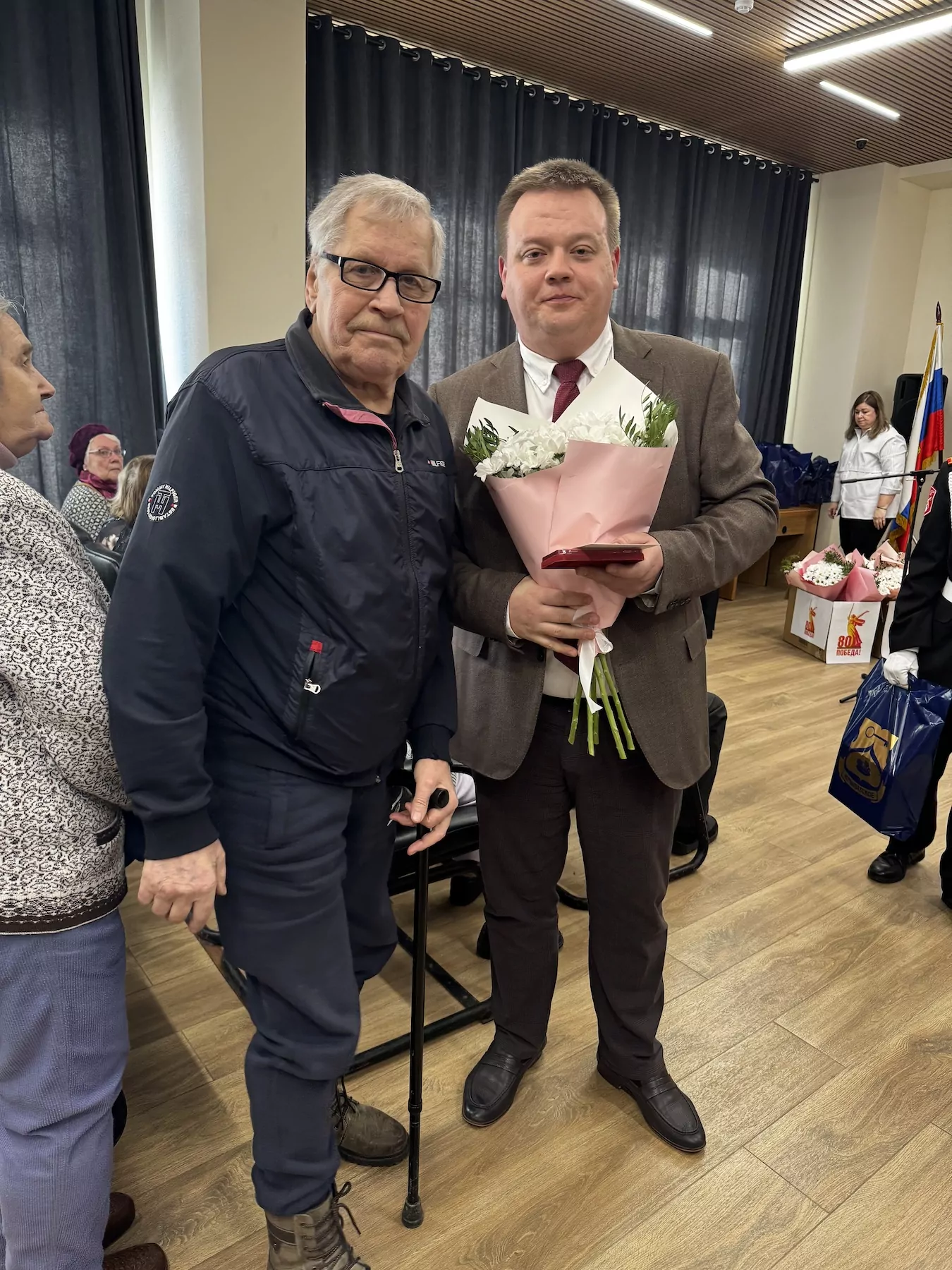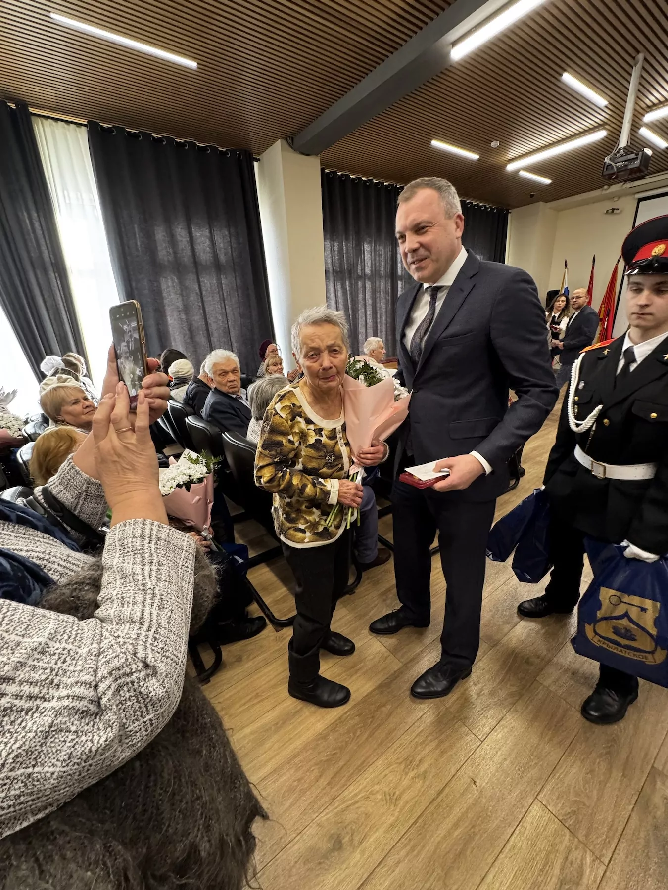 В зале управы собрались жители района, ветераны и кадеты школы № 1440. После внесения знамени Победы с поздравительной речью выступил глава управы Крылатское Иван Лахно.